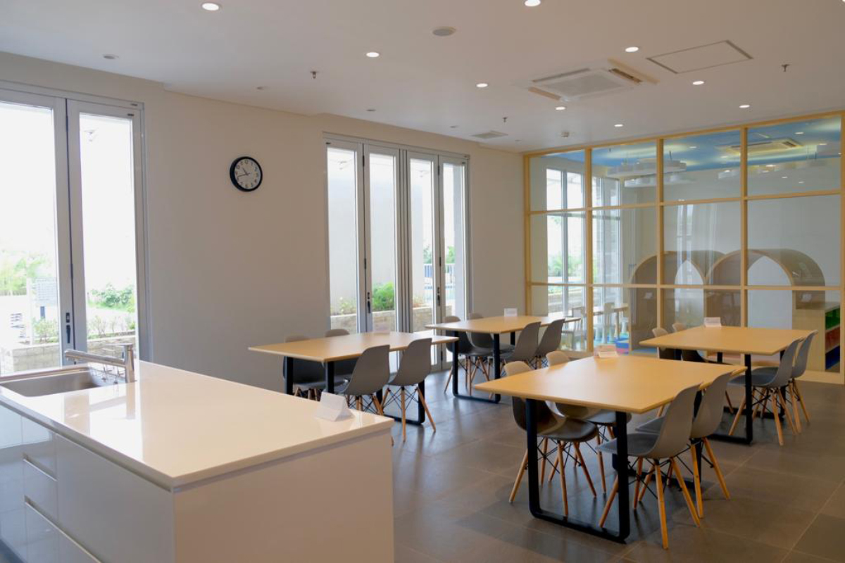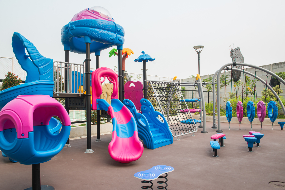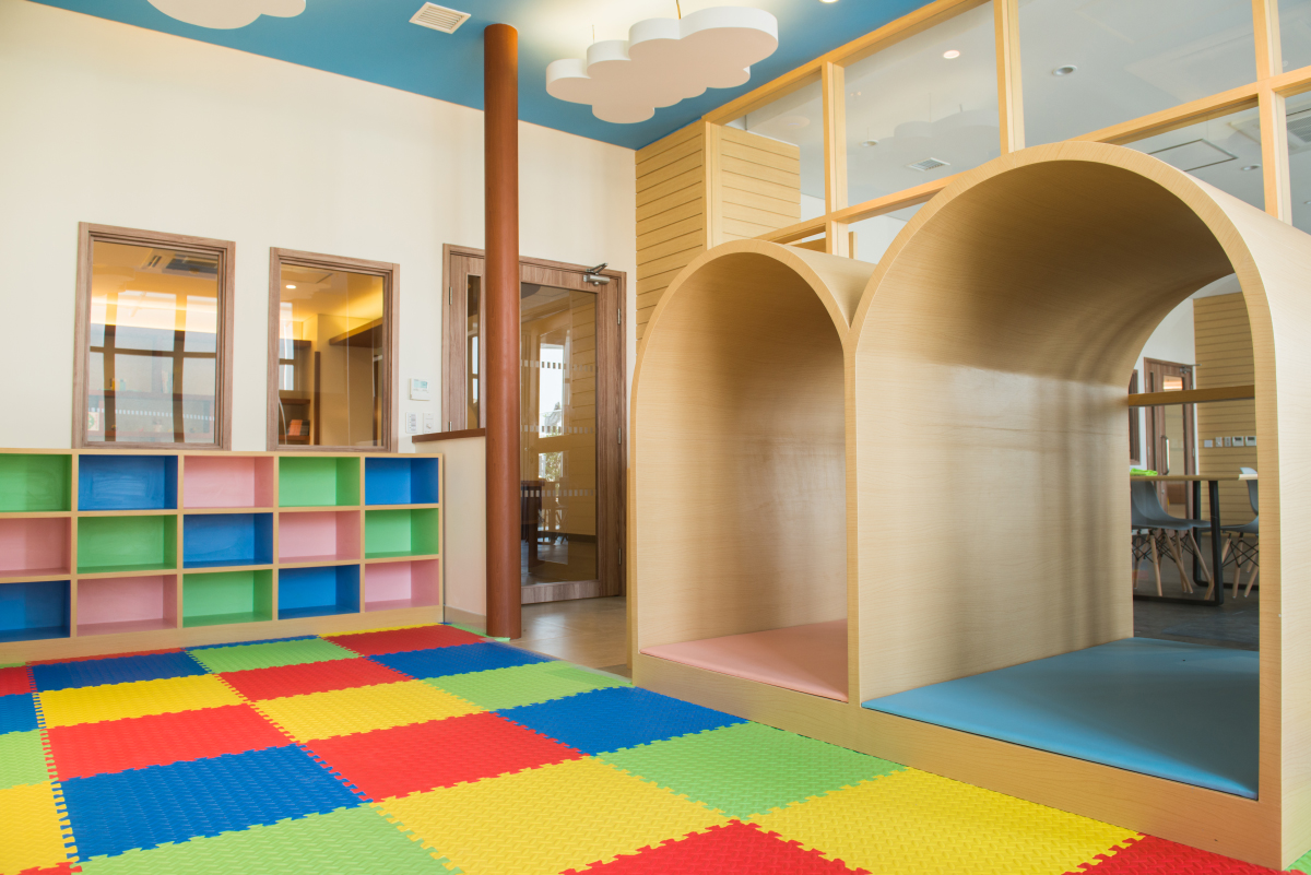 A slide and jungle gym are installed. Soft mats are used on the floor, allowing children to play safely