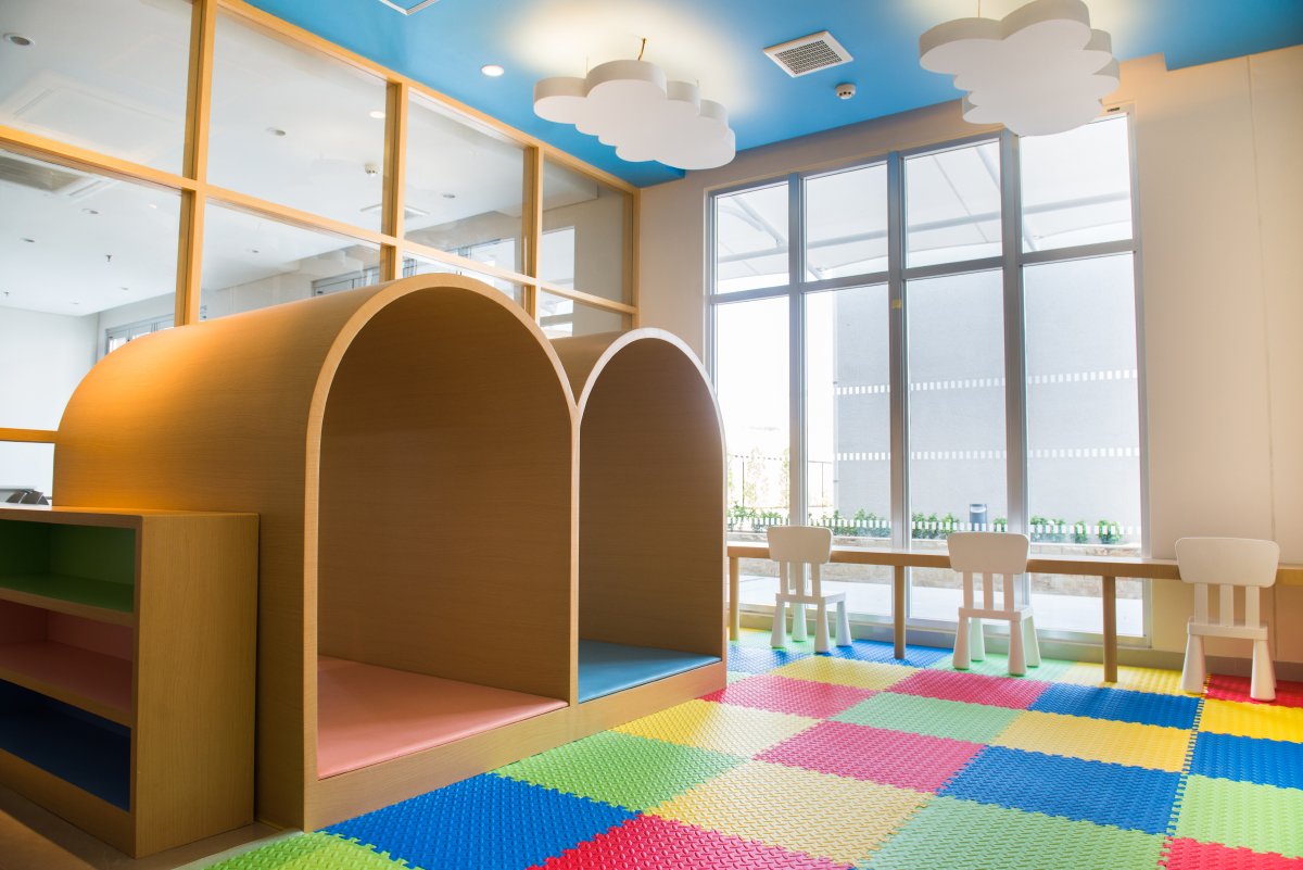 The floor is made of soft baby mats. The children's play can be seen through the glass from the lounge space.