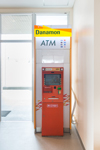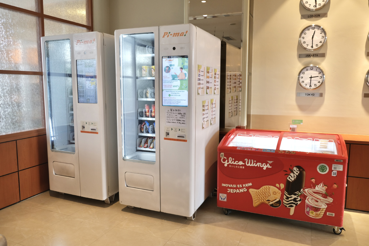 Spacious lobby space. There are vending machines, ice cream boxes, and a Danamon Bank ATM.