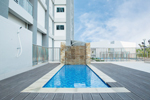 It is designed to be shallow, with a depth of 1.1 meters. There is also a kid's pool with a depth of about ankle-deep water, so parents and children can enjoy the pool together.